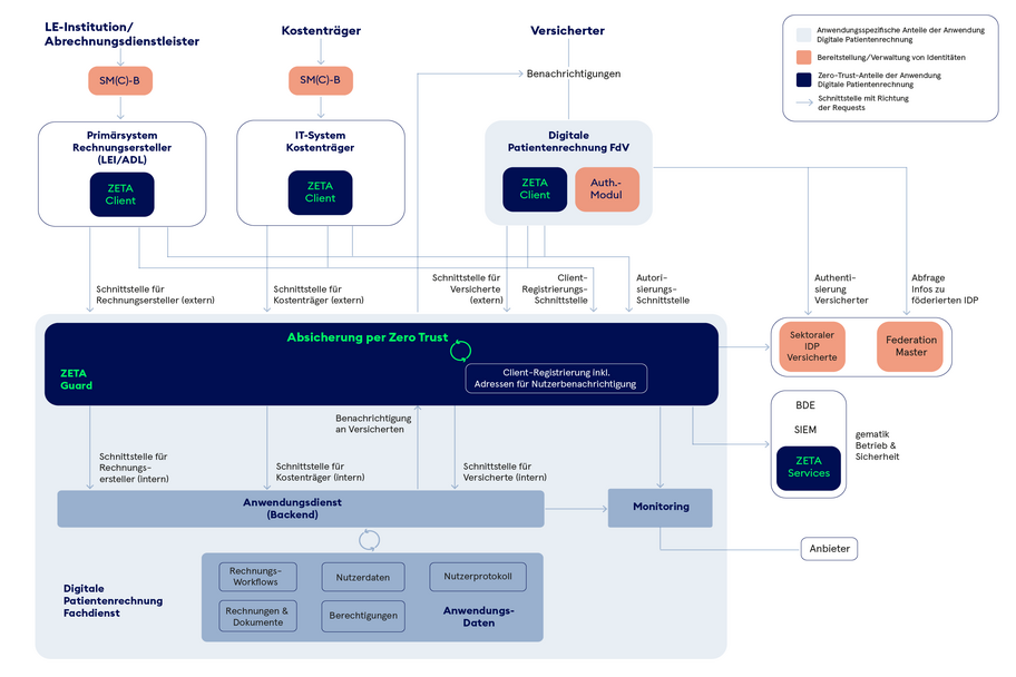 Die Sicherheitsarchitektur folgt dem Zero-Trust-Prinzip (ZETA). Registrierte und attestierte Clients sowie tokenbasierte Autorisierung gewährleisten, dass ausschließlich berechtigte Anwendungen auf Rechnungsdaten zugreifen können.