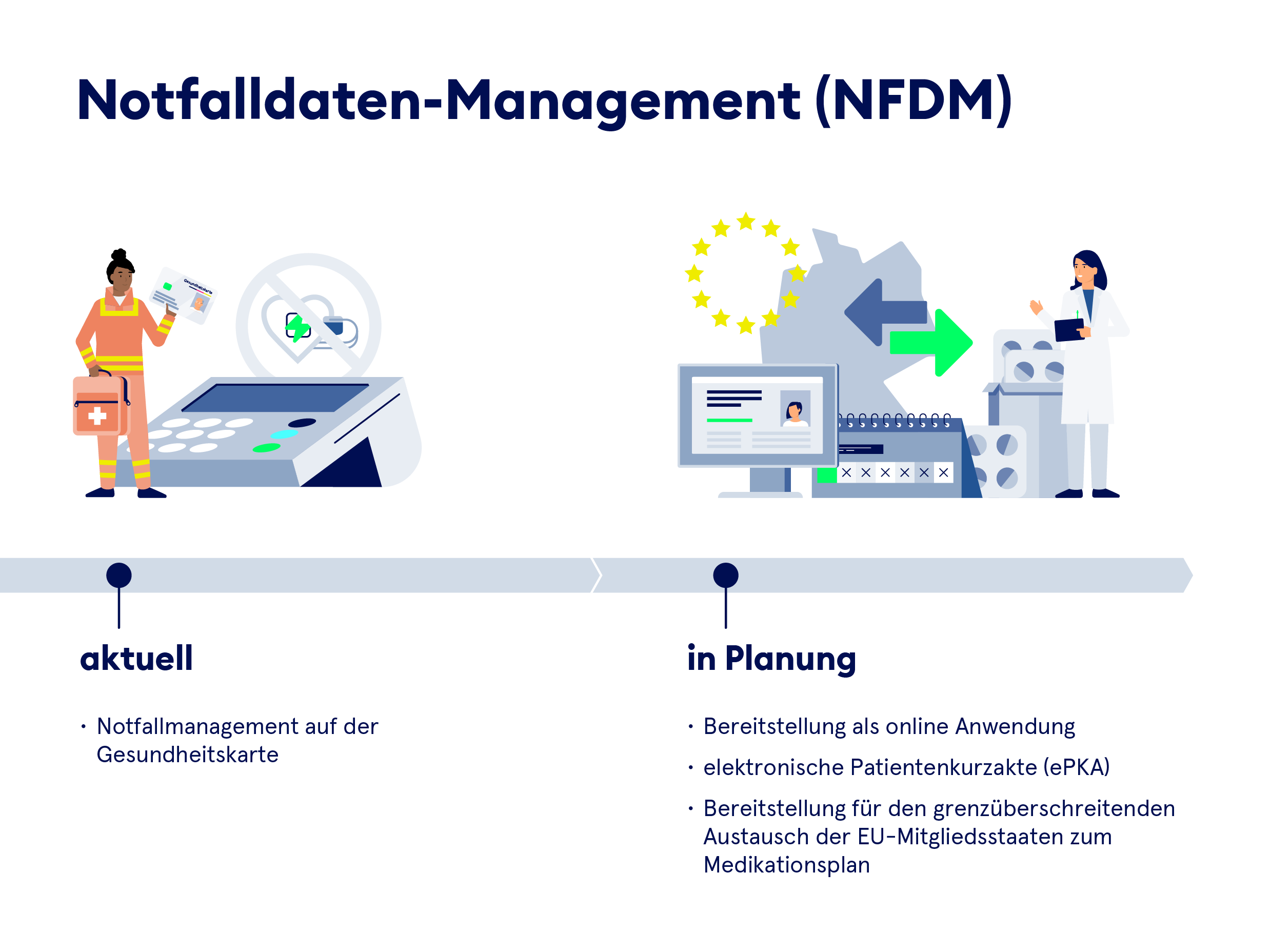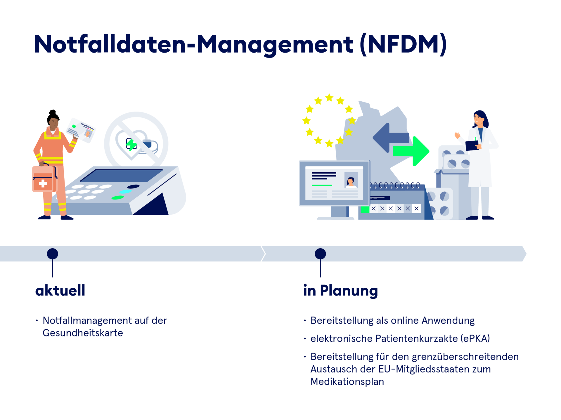 Mithilfe des Notfalldaten-Managements können notfallrelevante medizinische Informationen als Notfalldatensatz und Hinweise zum Ablageort von Willenserklärungen des Versicherten als Datensatz für die persönlichen Erklärungen direkt auf der Gesundheitskarte gespeichert werden.
