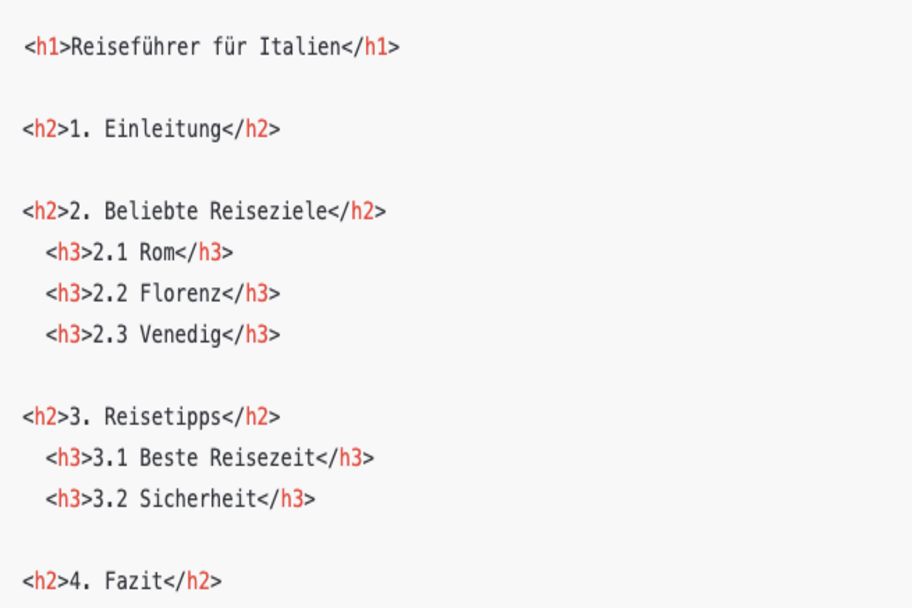 Die Ebenen der Überschriften folgen einer logischen Struktur wie in einem Inhaltsverzeichnis. Man sollte keine Ebenen überspringen (z. B. von <h2> direkt zu <h4>), es sei denn, es ist inhaltlich begründet.