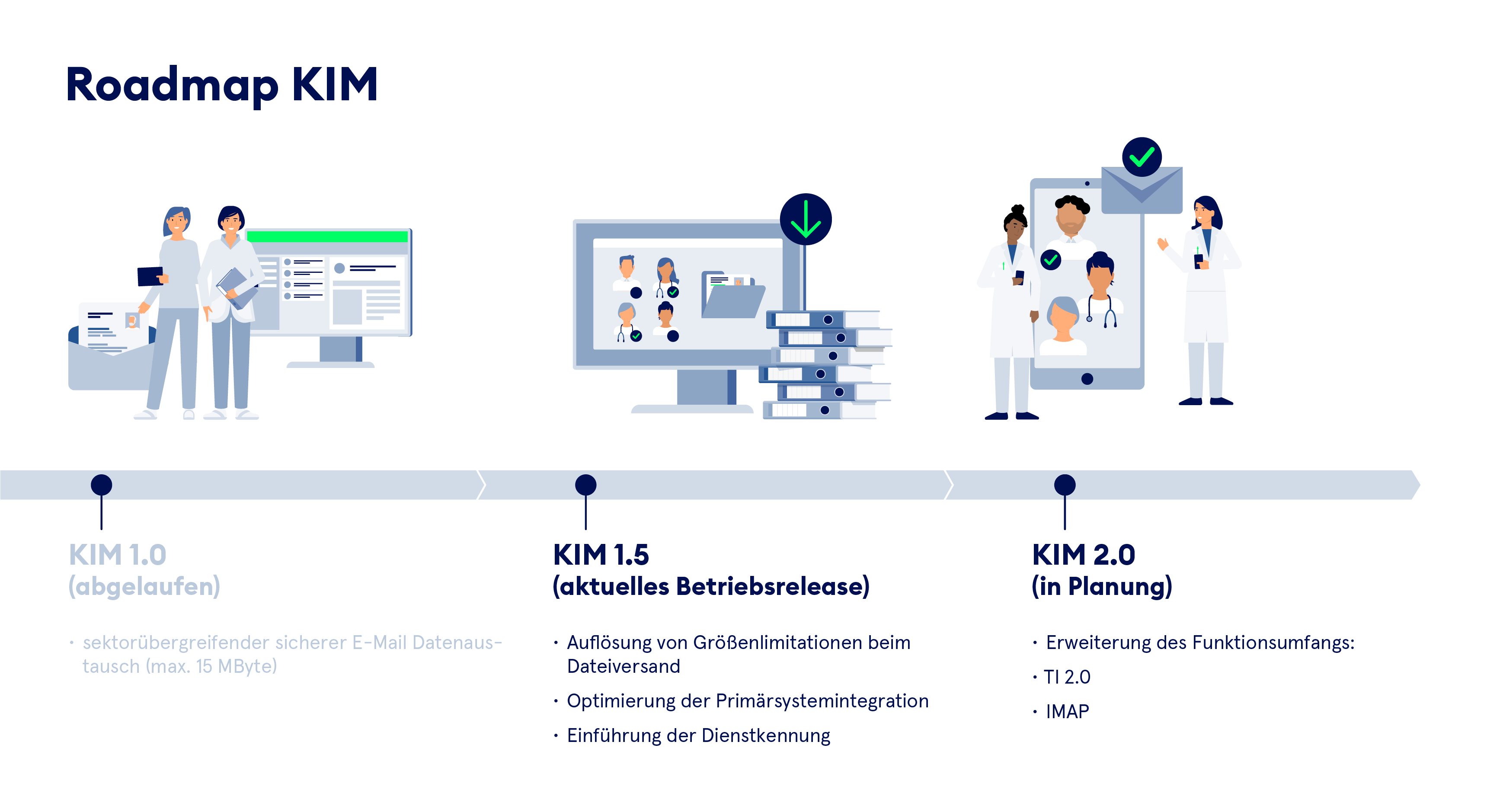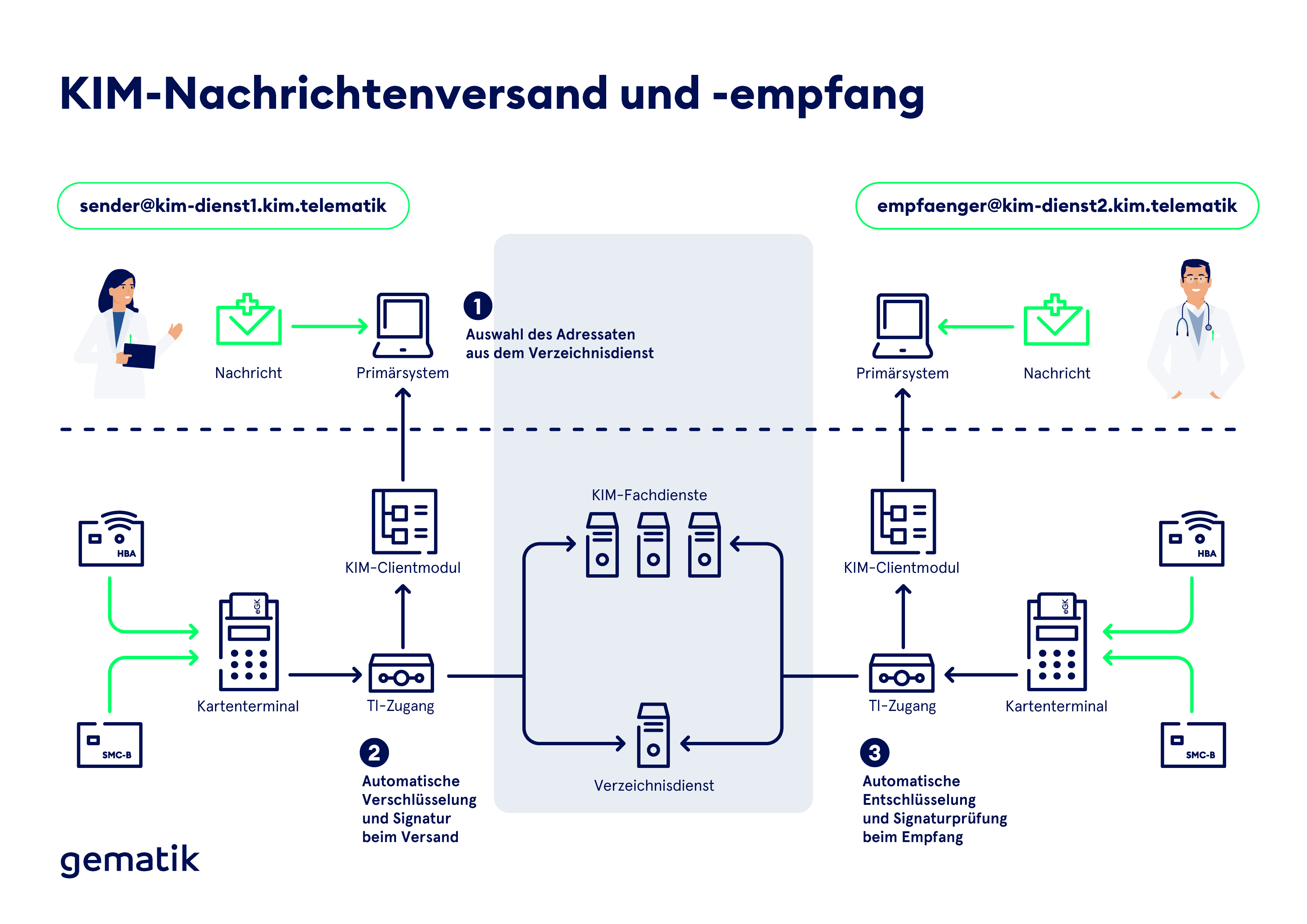 KIM (vormals: KOM-LE) ermöglicht den sicheren elektronischen Datenaustausch zwischen registrierten, authentifizierten Nutzern der Telematikinfrastruktur (TI). KIM vermeidet Medienbrüche und sichert den geschützten Versand der behandlungs-, therapie- und abrechnungsrelevanten Daten wie Arztbriefe, Befunde oder Abrechnungen.