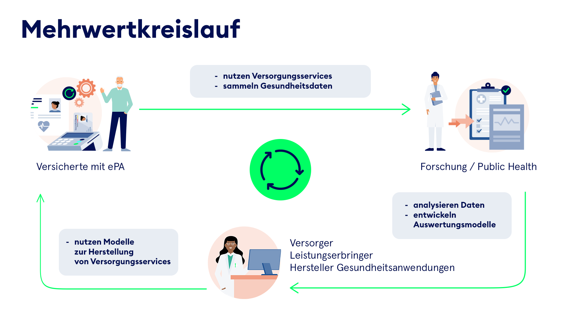 Ziel der Untersuchungen ist es, den technisch sicheren Datenaustausch der ePA-Daten zwischen den Anspruchsgruppen zu ermöglichen. Dabei berücksichtigt das Projektteam das Zusammenspiel von Versicherten, Forschenden und Leistungserbringern und integriert sie in einen gemeinsamen Mehrwertkreislauf.