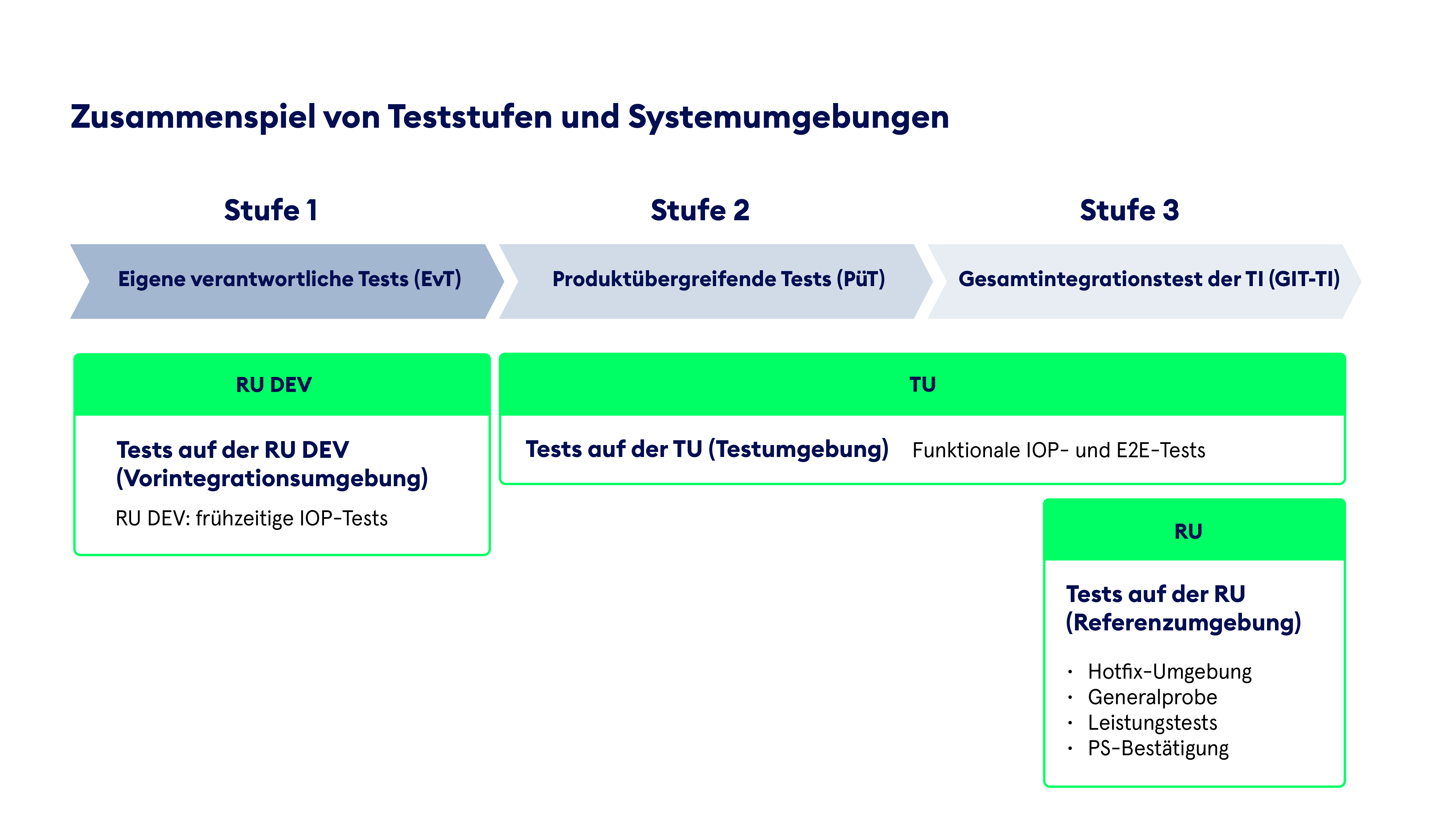 Die Durchführung der Tests erfolgt in klar definierten Systemumgebungen, die aufeinander aufbauen und spezifische Testziele verfolgen: