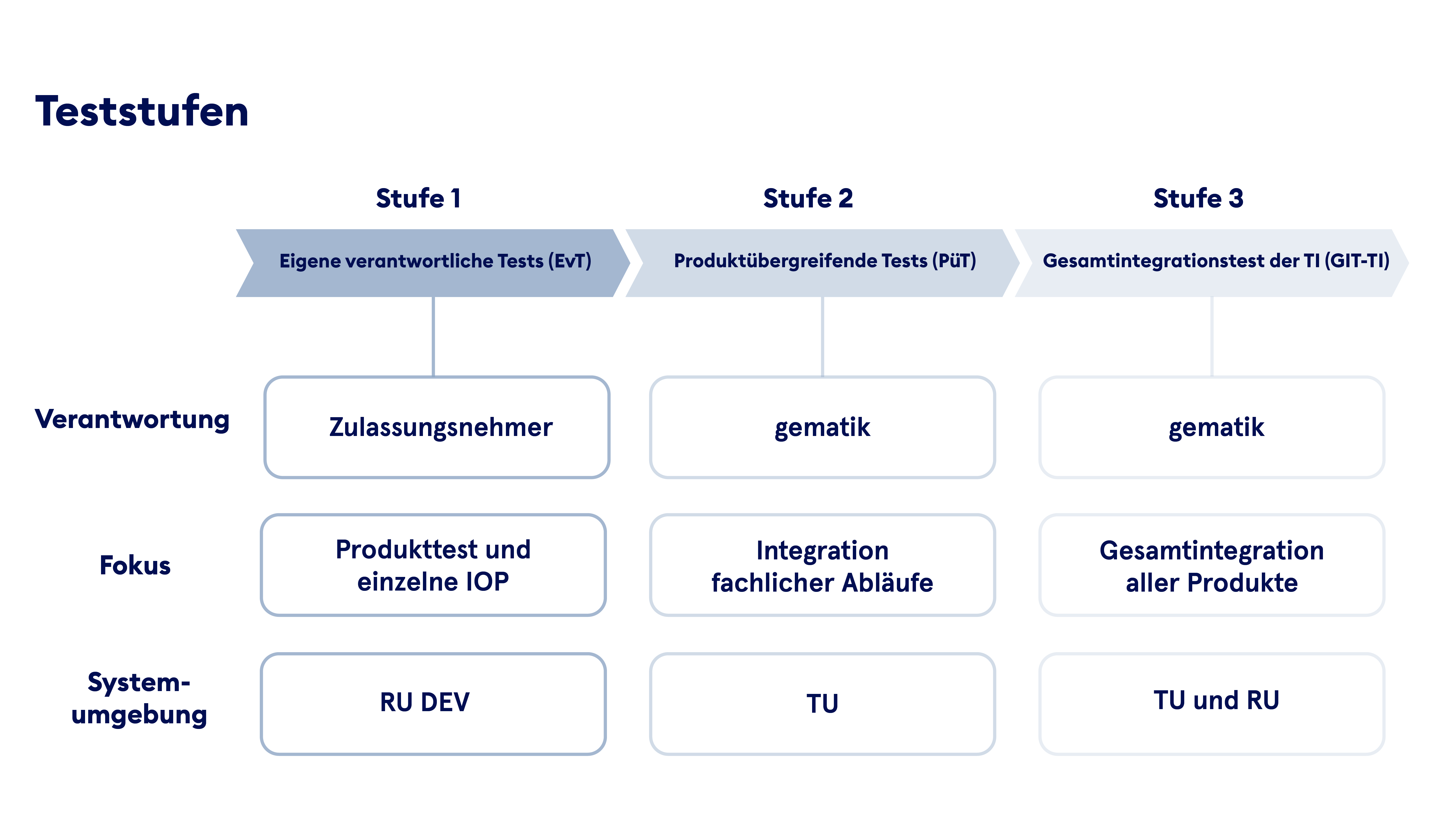 Die gematik verfolgt einen mehrstufigen Testprozess, der von eigenverantwortlichen Tests der Hersteller über produktübergreifende Prüfungen, bis hin zu abschließenden Tests in einer Referenzumgebung reicht. Ziel ist es, die Funktionalität, Interoperabilität und Stabilität der Produkte im Rahmen von Zulassungs- und Bestätigungsverfahren sicherzustellen.